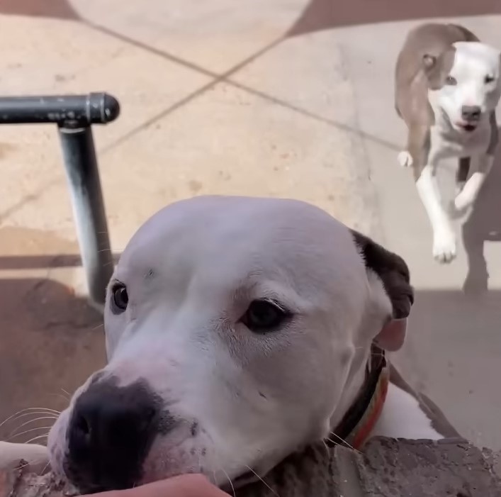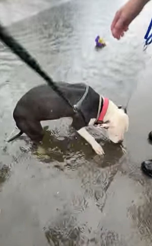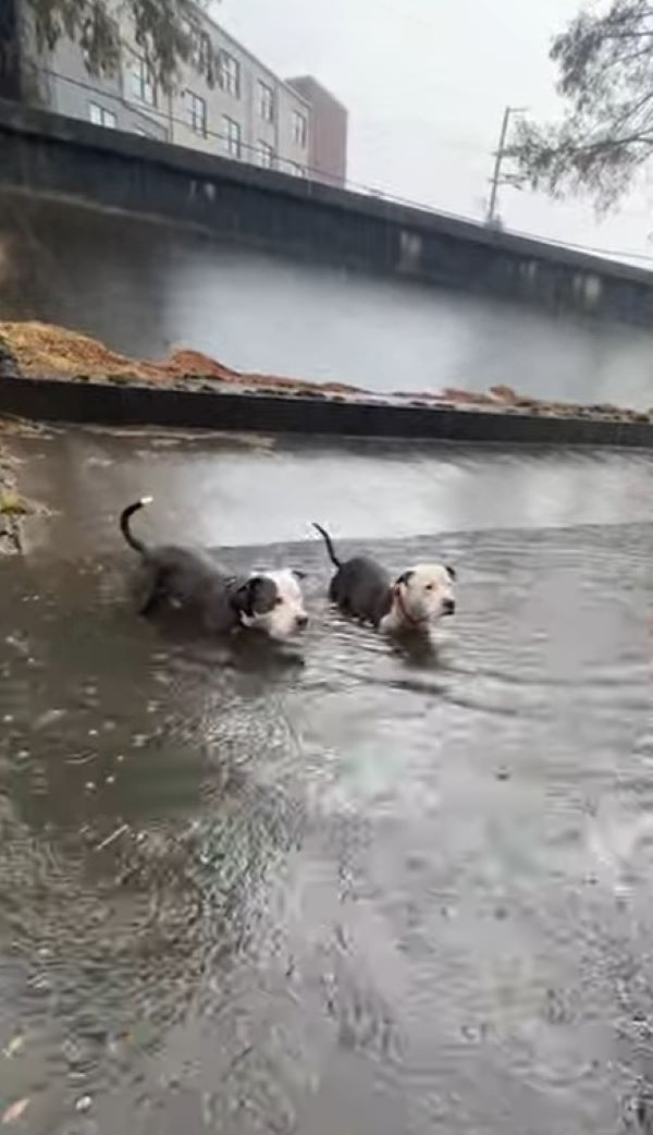When the team reached the scene, they were devastated to find two Pit Bulls stranded in the water, visibly frightened and unsure of their surroundings.