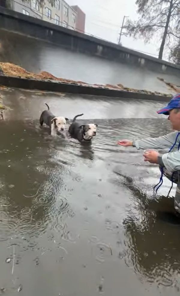 At first, Francis and Norman barked nervously, uncertain whether the people approaching them could be trusted. But once the rescuers stepped into the canal, the dogs began to understand that help had finally come.