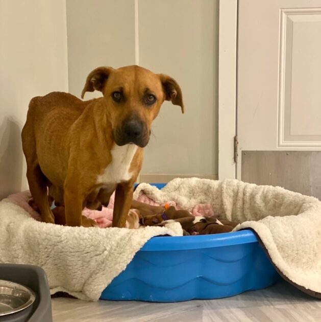 “I remember walking in the room and seeing her cowered in the corner over top of her two-day old babies. She was so scared. Shaking and not letting us get too close to her or the babies,“ one of her rescuers told The Dodo.