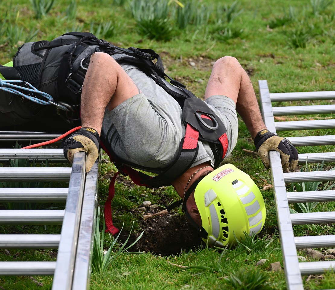The team first attempted to lift Rip using webbing, but the effort didn’t succeed. Realizing a different method was needed, they lowered a ladder into the sinkhole.