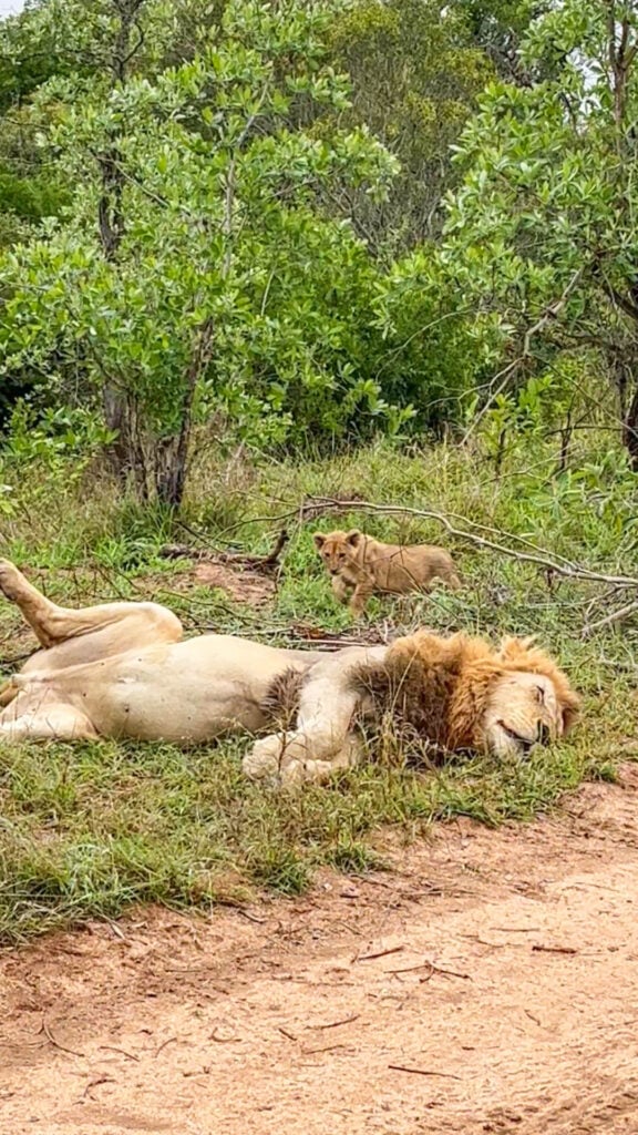 The large male lion showed no intention of waking up any time soon. He lay sprawled out on the grass, enjoying some shut-eye. This might’ve been disappointing for the guests had it not been for a tiny cub which soon appeared on the scene. The little guy held the spectators’ attention.
