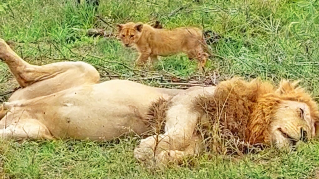 The large male lion showed no intention of waking up any time soon. He lay sprawled out on the grass, enjoying some shut-eye. This might’ve been disappointing for the guests had it not been for a tiny cub which soon appeared on the scene. The little guy held the spectators’ attention.