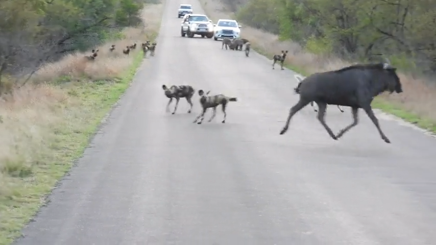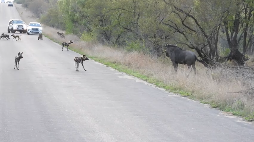 This was when a wildebeest appeared on the scene. The hefty animal made its way towards the road, oblivious to the large pack of wild dogs which were gathered there.