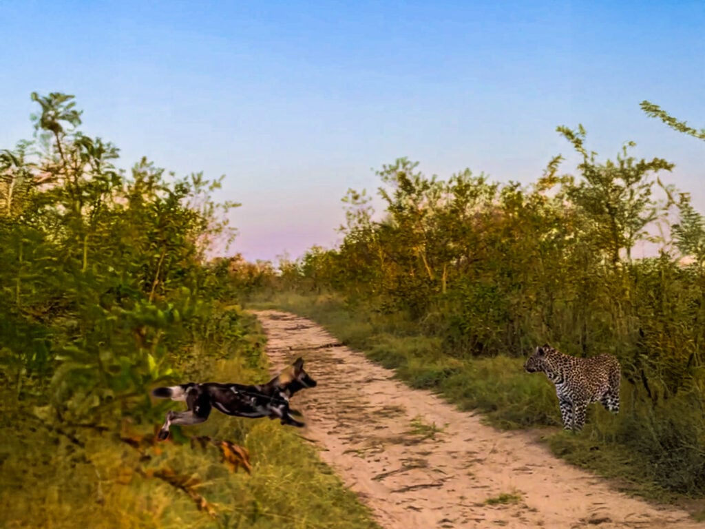 The wild dog’s decisions were a little more surprising. It’s unclear exactly how many dogs were hunting the impala, but several of them quickly broke off in order to follow the leopard and harass it.