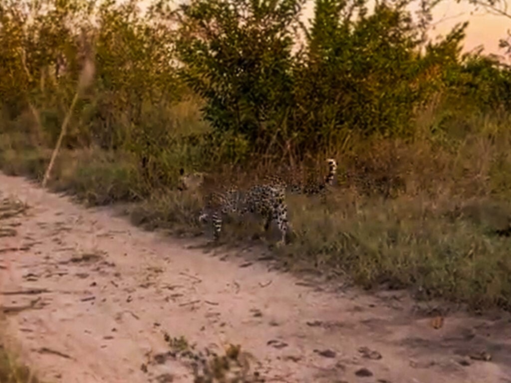 This female leopard had sensed the impala coming, and positioned herself at the side of the road, near some long grass, ready to leap out when the impala came close enough, and fell it with a single savage blow.