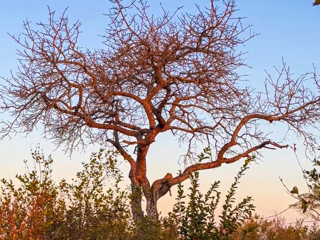 The leopard took only a short moment to make up its mind. It waited until it thought the coast was clear, and then it fled to the shelter of a nearby tree. Wild dogs might be excellent runners, but the leopard could easily out climb them.