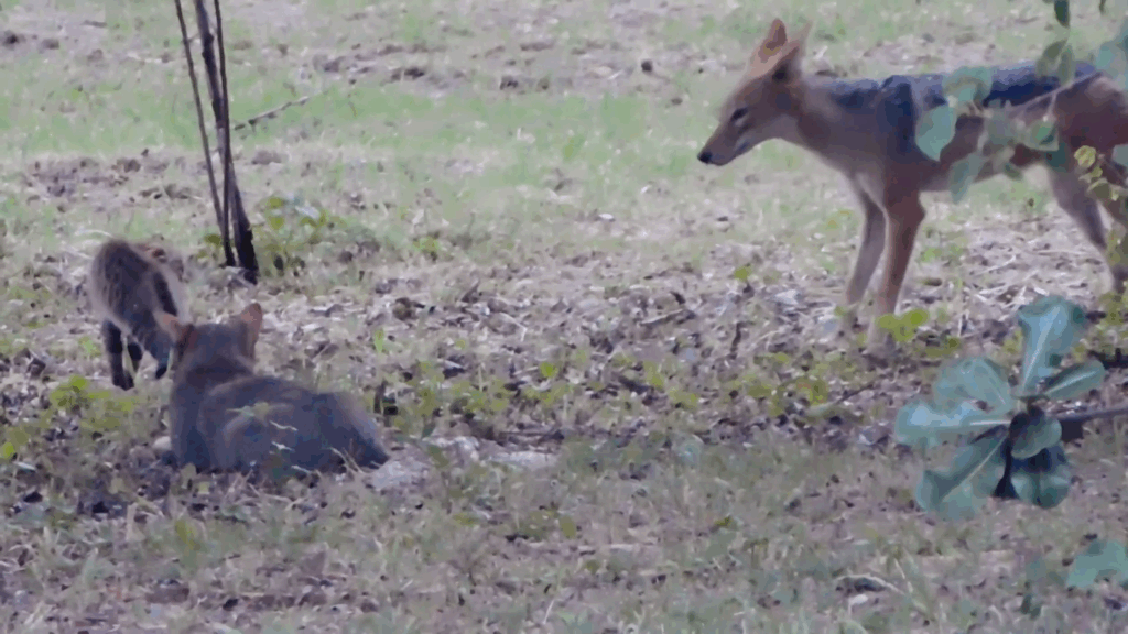 The adult wildcat seemed largely unbothered by the intrusion the entire time, although it would surely have reacted quickly and decisively if it needed to. The kitten, however, found the presence of the jackal absolutely unacceptable, and it made its views known.