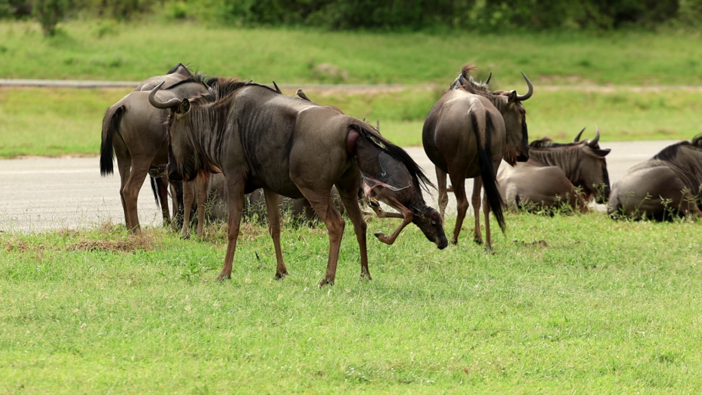 It’s touching to see how the wildebeest behind the cow watches with such apparent fascination. The drop to Earth will help expel any fluids from the calf’s lungs, allowing it to breathe freely at last.