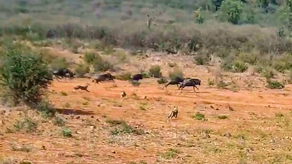 Cameras swung to follow as the reason for their urgency became clear: they were chasing a herd of wildebeest out on the open plains. The cheetahs’ focus was absolute, their bodies low and streamlined as they accelerated toward the herd with breathtaking speed.