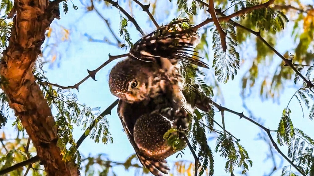 Andre explains how he had spotted two pearl-spotted owls, intertwined, and hanging from a low branch. “I wasn’t sure if it was a fight for territory or the mating process,” he began.