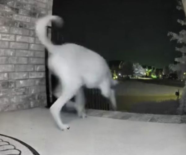 The video shows her dog quietly nudging the front door open in the middle of the night, allowing himself, and three of the family’s indoor cats, to slip outside.