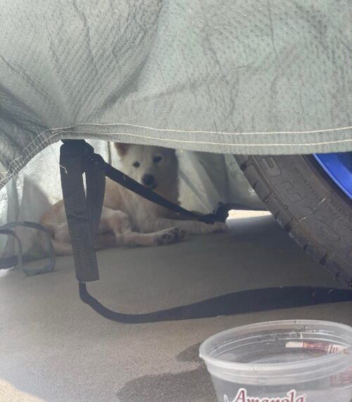 When she stopped to listen closely, she realized it was the desperate cries of a puppy. Following the sound, she discovered a small Jack Russell tangled in chicken wire and trapped deep inside a storm drain.