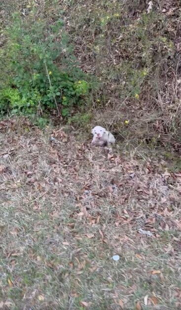 For days, a tiny white puppy lay stranded in a roadside ditch, frightened and alone, trying to make sense of why she had been left behind.