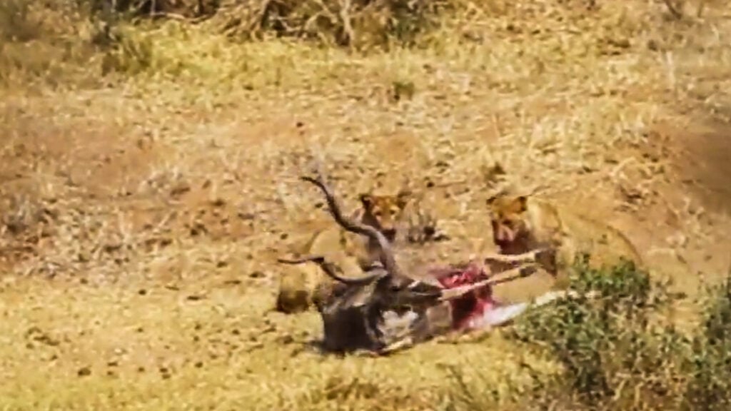 When lions take down a full-grown kudu, it is a brutal test of power and endurance. The takedown was explosive. The kudu stumbled under the weight of the lions. He fought, kicked and twisted, but he couldn’t get up.