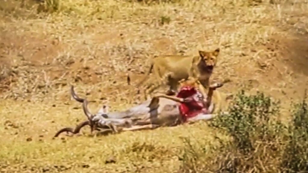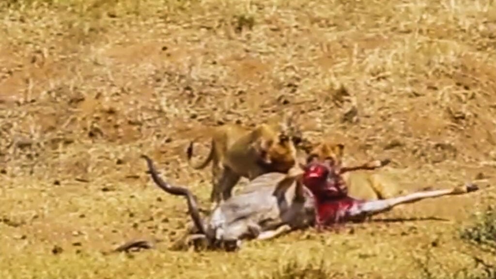 The initial damage to the kudu’s body wasn’t fatal and so the kudu remained clinging to life while the lions continued to feed.