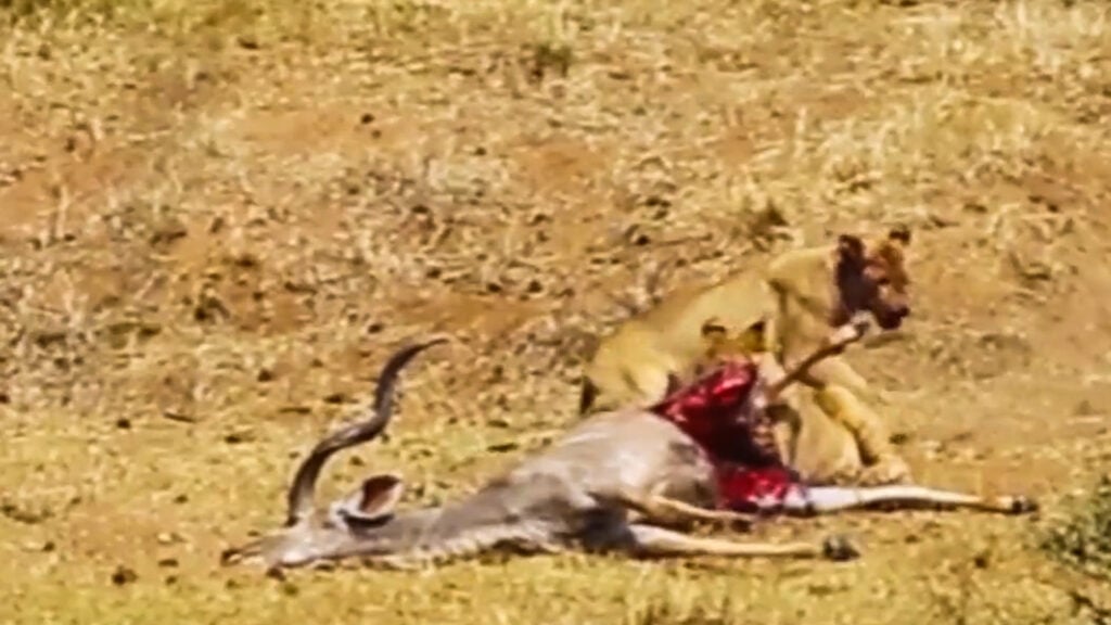 Kudu are sharp-eyed and can bolt in a second, so timing and teamwork from the pride are essential in securing a kill.