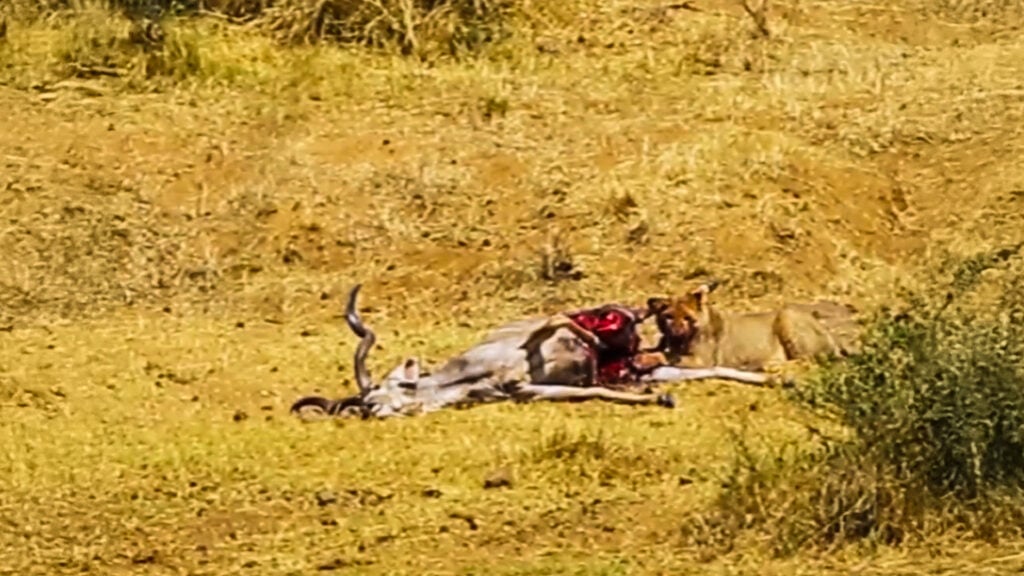 They went for the kudu’s hindquartres with full force. Lions are cautious of the kudu’s spiral horns. When hunting kudus, they try to avoid the front of the animal.